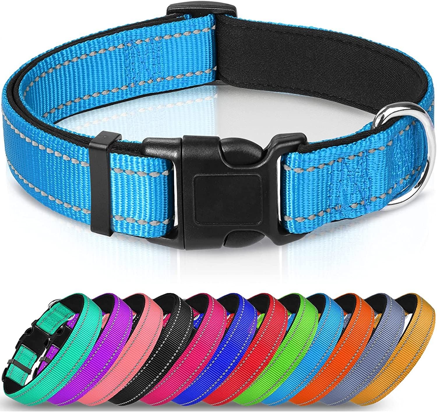 SAFETY: Highly reflective threads keep high visibility at night for safety.And you can easy find your furry pet in the back yard at night MATERIALS: Dog collar is made of nylon with padded neoprene rubber material. This material is durable; fast dries; flexible and ultra soft CLASSIC: This nylon dog collar is a classic yet stylish collar that comes in 12 colors and 5 sizes so you can find just the right one for your dog. A separate loop on the collar makes it easy to add dog tags and leashes onto the collar CONVENIENT: Quick release premium ABS made buckles; easy to adjust length and put it on/off. The plastic buckle is curved for your dog's comfort SIZE: X-Small Width 5/8"; Neck Size 8"-12"; Small Width 3/4"; Neck Size 12"-16"; Medium Width 1"; Neck Size 14"-20"; Large Width 1"; Neck Size 16"-24"; XLarge Width 1 1/4"; Neck Size 18-28"