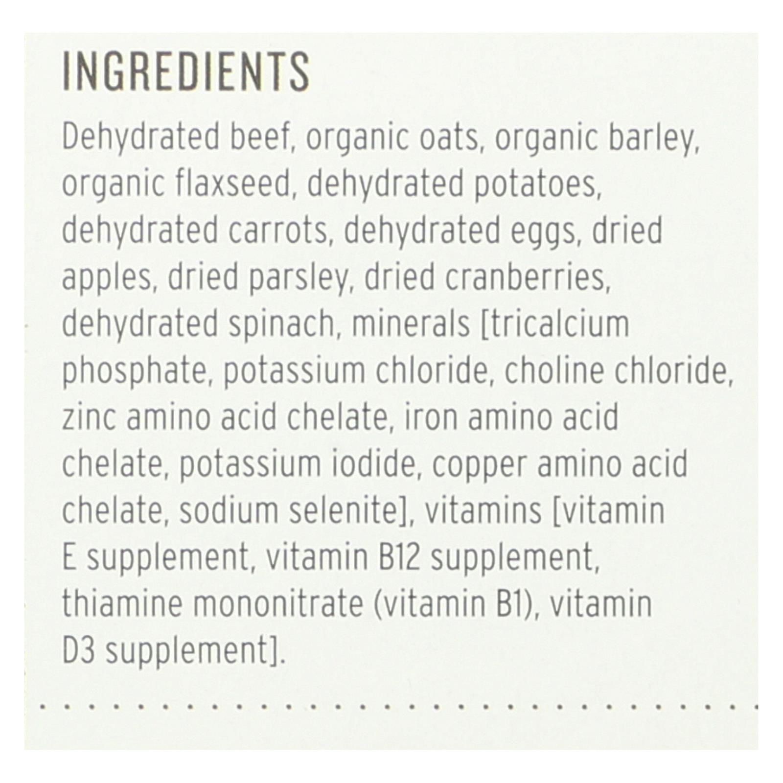 ingredients : dehydrated beef;organic oats;organic barley;organic flaxseed;dehydrated potatoes;dehydrated carrots;dehydrated eggs;dried apples;dried parsley;dried cranberries;dehydrated spinach;minerals [tricalcium phosphate;potassium chloride;choline chloride;zinc amino acid chelate;iron amino acid chelate;potassium iodide;copper amino acid chelate;sodium selenite];vitamins [vitamin e supplement;vitamin b12 supplement;thiamine mononitrate;vitamin b1;vitamin d3 supplement]
